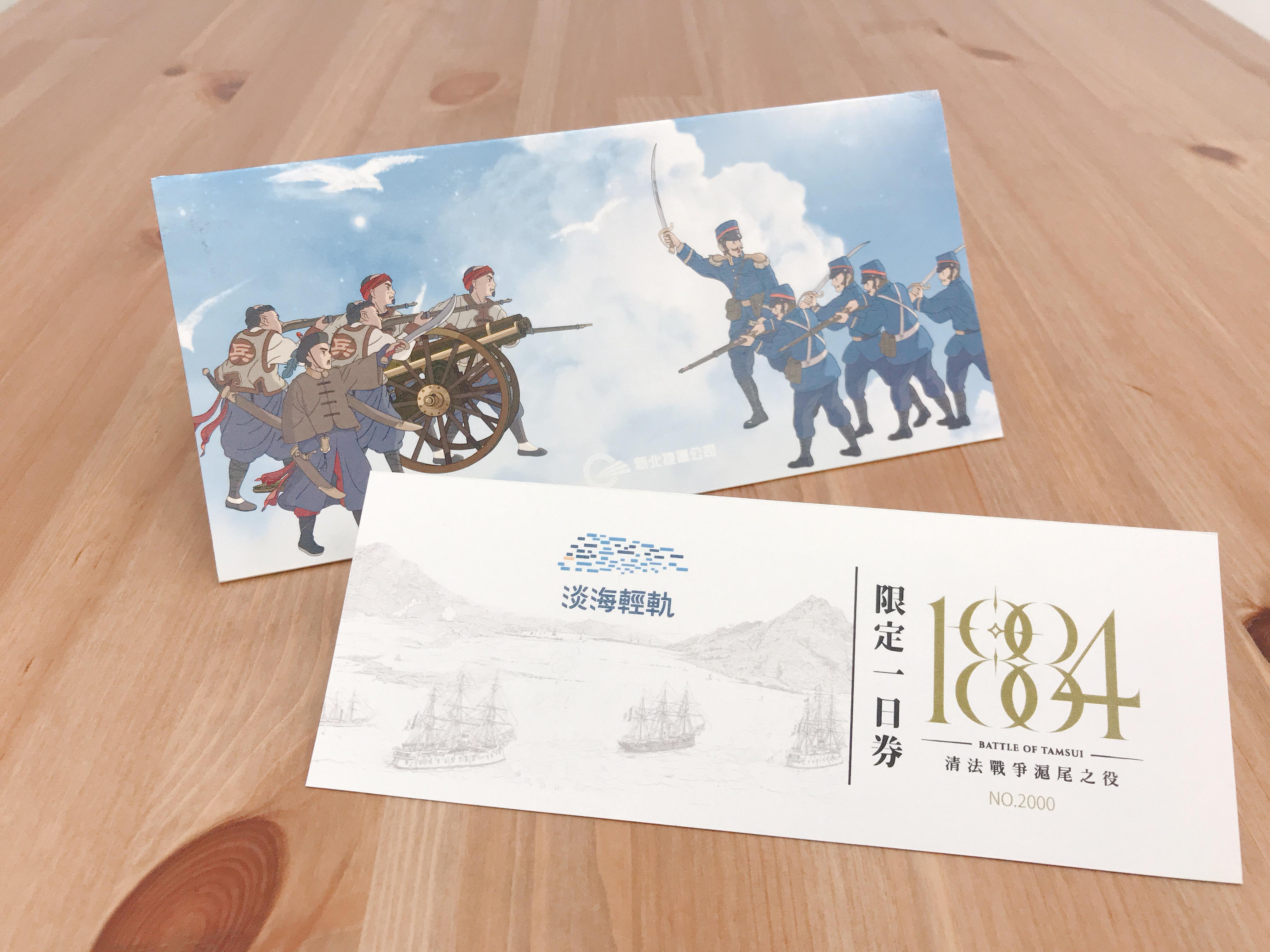 新北捷運公司表示,為了共同推廣淡水在地文化特色,淡海輕軌特別與國內插畫家合作,推出帶有『你的名字』動畫風格的畫風的清法戰爭主題彩繪列車與限量1884套的『清法戰爭紀念版一日票』,每張車票擁有獨立票號且皆燙金字設計,加上雅緻的外封套以及清法戰爭主題明信片,展現出質感與獨特性,每份售價99元,10月10日上午6時起於輕軌紅樹林站限量發售,並同步於新北捷運公司官網販售(票號隨機出貨),網路購票可享9折優惠,歡迎喜歡特色車票的民眾購買收藏,國慶連假期間,購買紀念版一日票的民眾還可於上午9時至下午5點憑票免費體驗穿著清朝服裝與主題彩繪列車拍照留念,每張票限兌換一次。