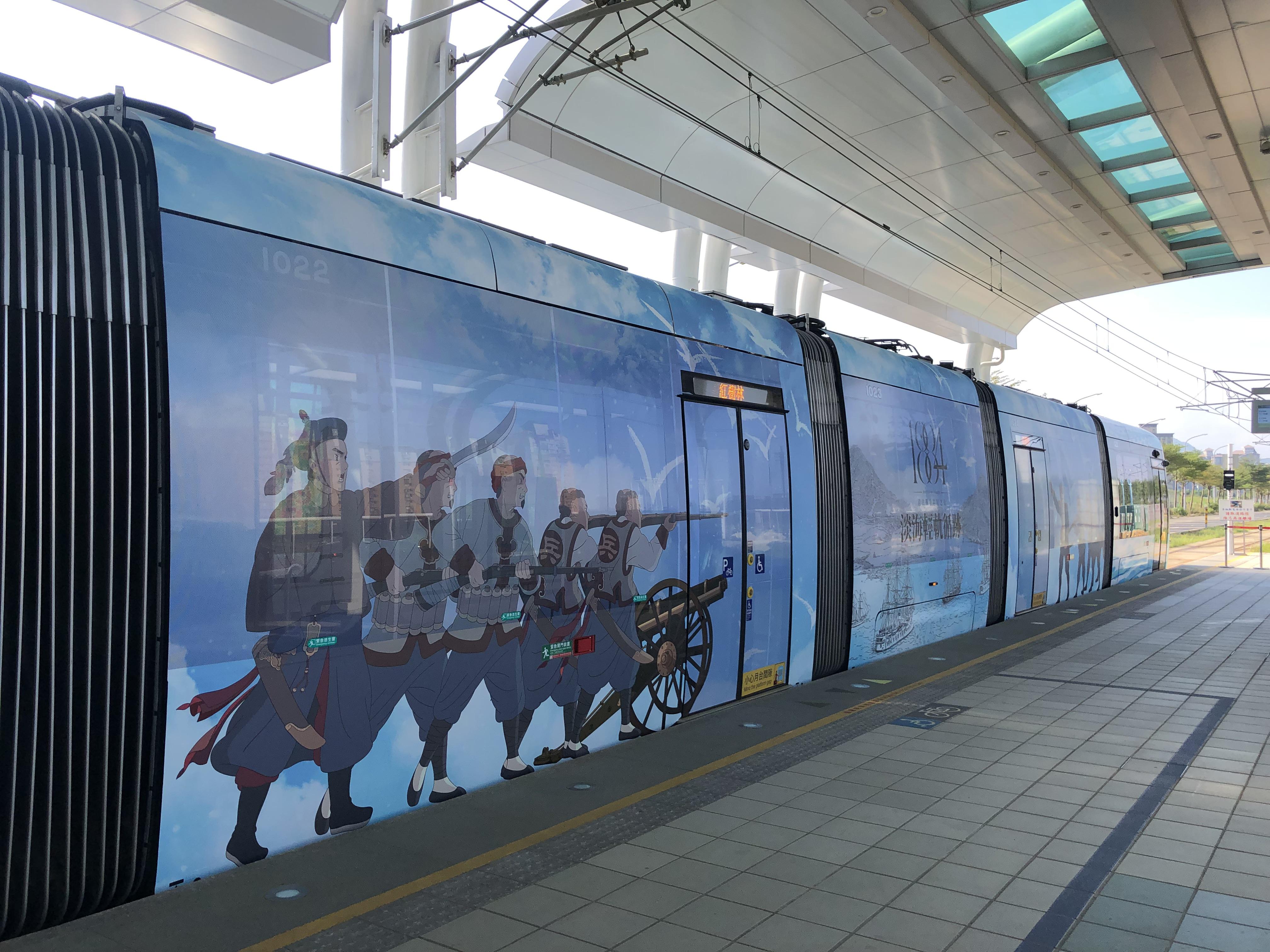 【新北市訊】淡海輕軌列車首次變裝! 新北捷運公司表示,西元1884年在淡海輕軌沿線的淡水沙崙地區曾經發生史上著名的清法戰爭滬尾之役,今年適逢清法戰爭135周年,新北捷運公司與新北市政府文化局、淡水古蹟博物館合作,自10月10日國慶連假開始推出「清法戰爭主題彩繪列車」,同時發行限量1884份的紀念版一日票,每份售價99元,也將於新北捷運公司官網同步銷售,喜愛彩繪列車與收集特色車票的民眾千萬不要錯過! 國慶連假期間,購買限量一日票的民眾還可憑票於特定時間在輕軌紅樹林站免費體驗穿著清朝服裝與主題彩繪列車拍照留念。