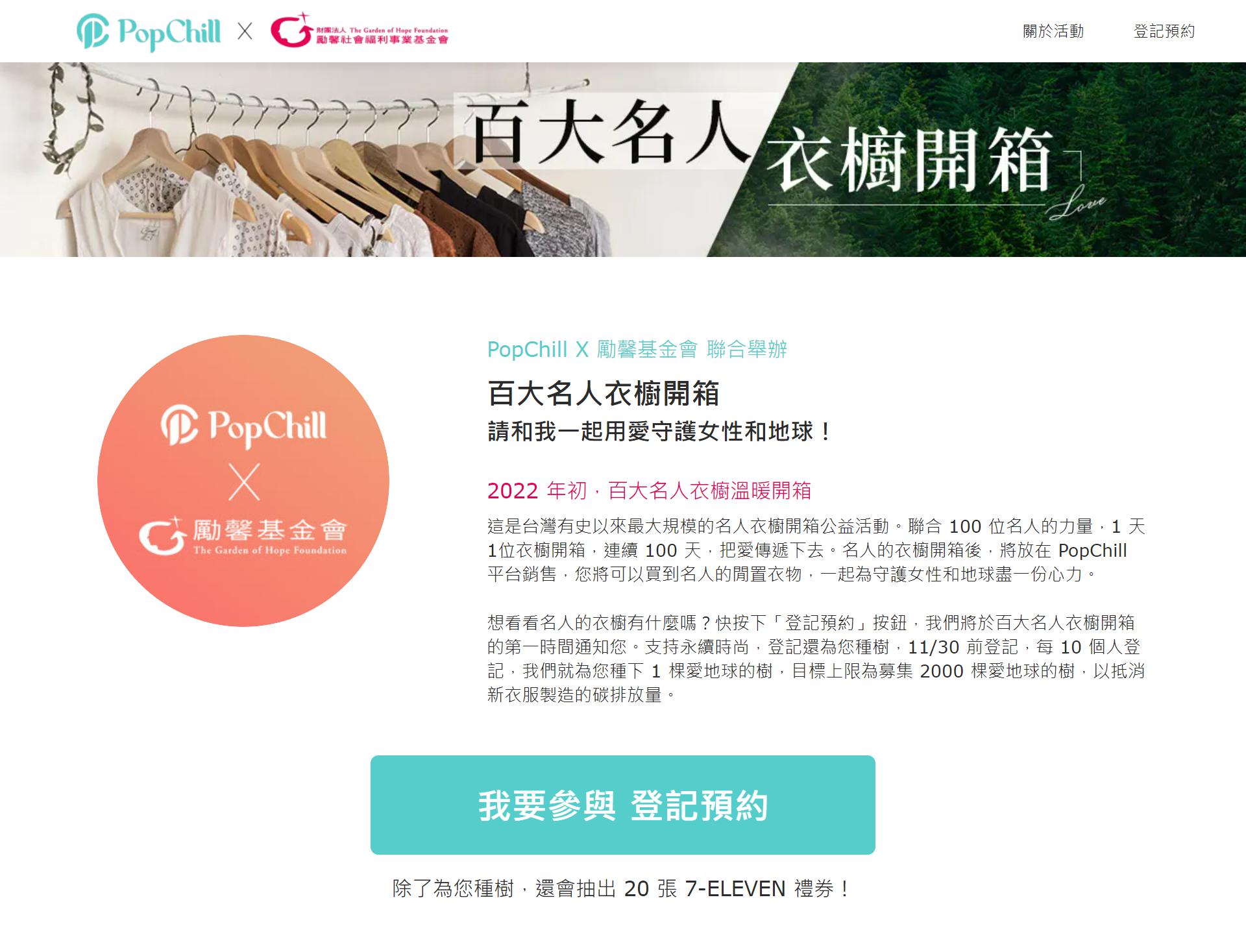 受疫情影響,名人實體二手衣義賣已停擺近一年。新創時尚轉售電商PopChill與勵馨基金會聯手舉辦「百大名人衣櫥開箱公益Party」,把活動搬到網路上,聯合100位名人的力量,號召大家一起做公益。名人提供私服將於明年初開賣,連續100天,每天開箱1位名人衣櫥,訴求一棒接一棒,把愛傳遞下去。預熱活動於10/27提前開跑,讓對名人二手衣有興趣的人預約登記,於名人衣櫥開箱時獲得第一手通知,平台預期登記數將達數萬人。本活動主辦單位為:PopChill、勵馨基金會,協辦單位: 聯合新聞網、Cheers、網路溫度計、Shopping Design 、痞客邦 、Yahoo!、女人迷、妞新聞、BabyHome、ELLE、Every little d。