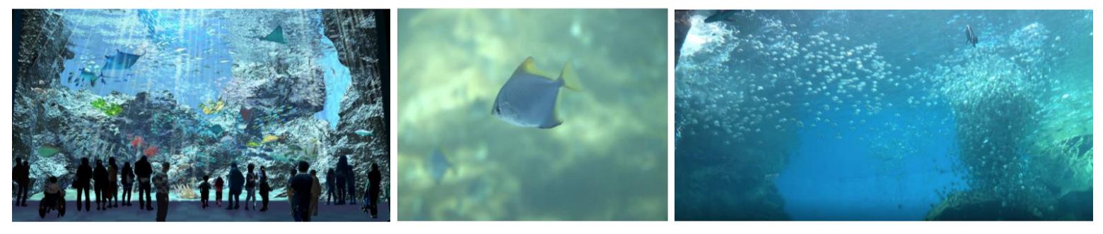 在連氣溫、濕度、味道及聲音都經過縝密計算的空間裡,從天花板到地坪、延伸至水槽的影像演出呈現出360°具魄力的沉浸式空間。來訪的遊客並非單純透過壓克力玻璃觀賞生物,而是彷彿真得身歷其境,可以使用五感體驗各真實場景。