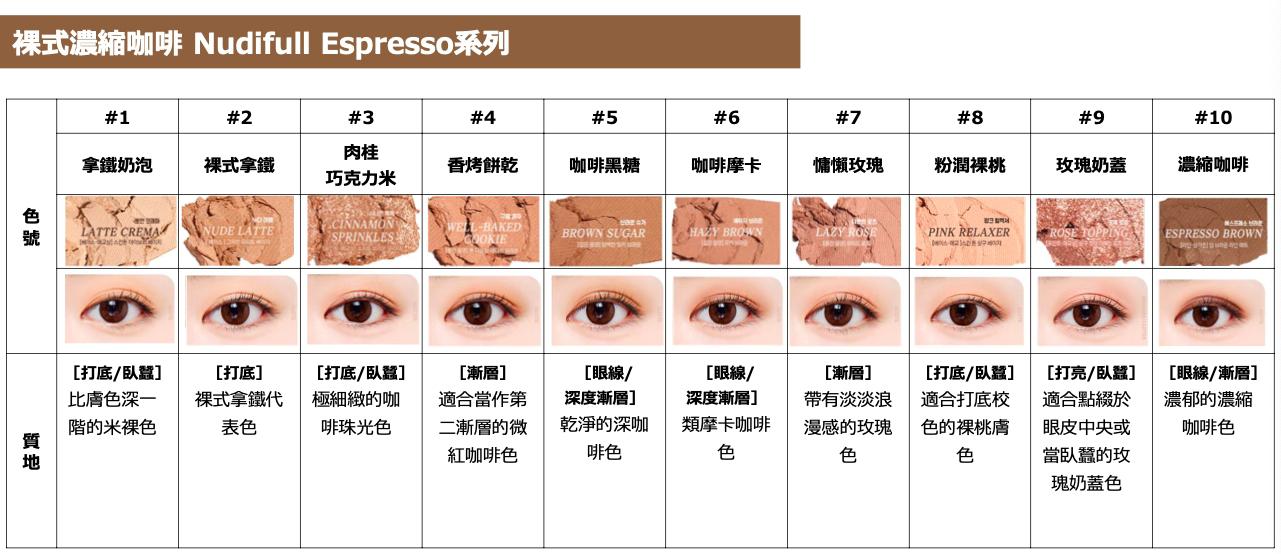 #裸式濃縮咖啡眼彩盤能渲染出自然個性裸咖啡10色,彷彿能聞到濃縮咖啡的香氣, 綻放極簡質感氛圍的裸玫色調,裸膚加上玫瑰,進階式色調搭配穿搭選色,營造乾淨極簡妝感。