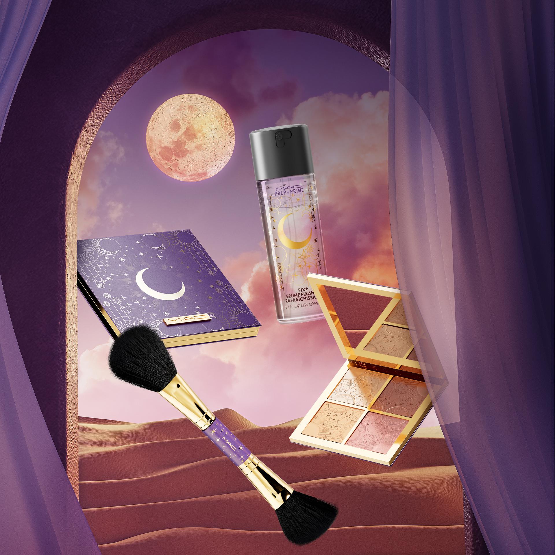 夜暮初降,伴隨落日餘暉透出淡淡紫光,為神秘夢幻的浪漫紫夜開啟無限遐想,M·A·C全新限量「月夜星辰系列」以廣闊無邊的皓月星空為靈感,致敬既神秘又婀娜的東方風情,深沉如夜、皎潔如白月光、亦柔軟如輕紗。深紫色外包裝上奪目閃耀的金色彎月,以及沿伸交織出的點點星空,讓人瞬間墜入清涼如絲的月夜懷抱,全系列含 #6色眼影盤、#四色打亮盤,4款 #時尚專業唇膏 與 #唇線造型筆、蒐藏控妝迷們必收的 #活力水噴霧、全新 #防水雙效眼線液筆 與一次合體腮紅、定妝刷 #129刷、以及斜角修容刷 #168刷的雙頭 #專業彩妝刷。