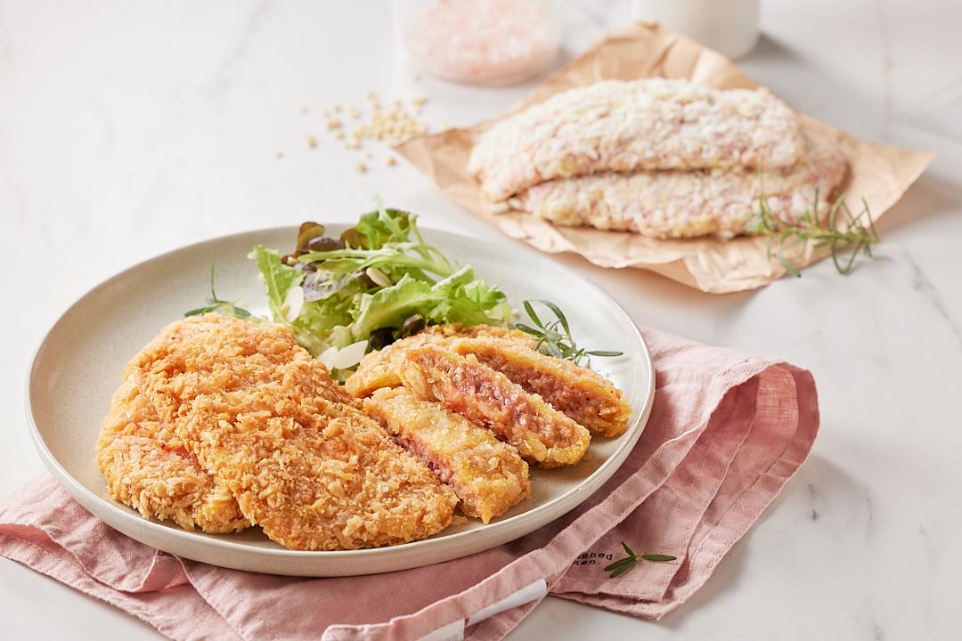 以台灣人喜愛的日式炸豬排為靈感設計,一樣的酥脆爽口,卻不用擔心膽固醇及油脂攝取問題!肉質上以長纖維組成,彈性咬感更鮮明,並採用台畜明星商品好欣豬豬排外衣相同的獨門配方,減去所有動物性成分調整為全素配方,卻仍保留金黃及酥脆的美味口感,令人吮指回味!