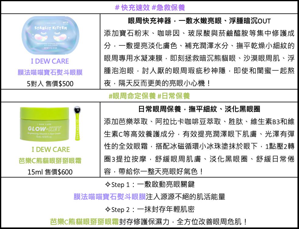 現代人熬夜追劇早已是家常便飯,且大量使用3C用品,雙眼疲勞、乾燥、暗沉藏也藏不住!憧憬韓劇女主角不說話也能用眼神傳遞超強氣場,眼周保養不能忽視,美韓最潮純素保養品牌I DEW CARE,不僅要好玩更要求高效,特別在維他命CC家族中推出芭樂C熊貓眼掰掰眼霜,搭配冰磁循環小冰珠,保養按摩二合一,徹底舒緩眼周疲憊壓力,使明眸大眼成標配,全天候放電有神。
