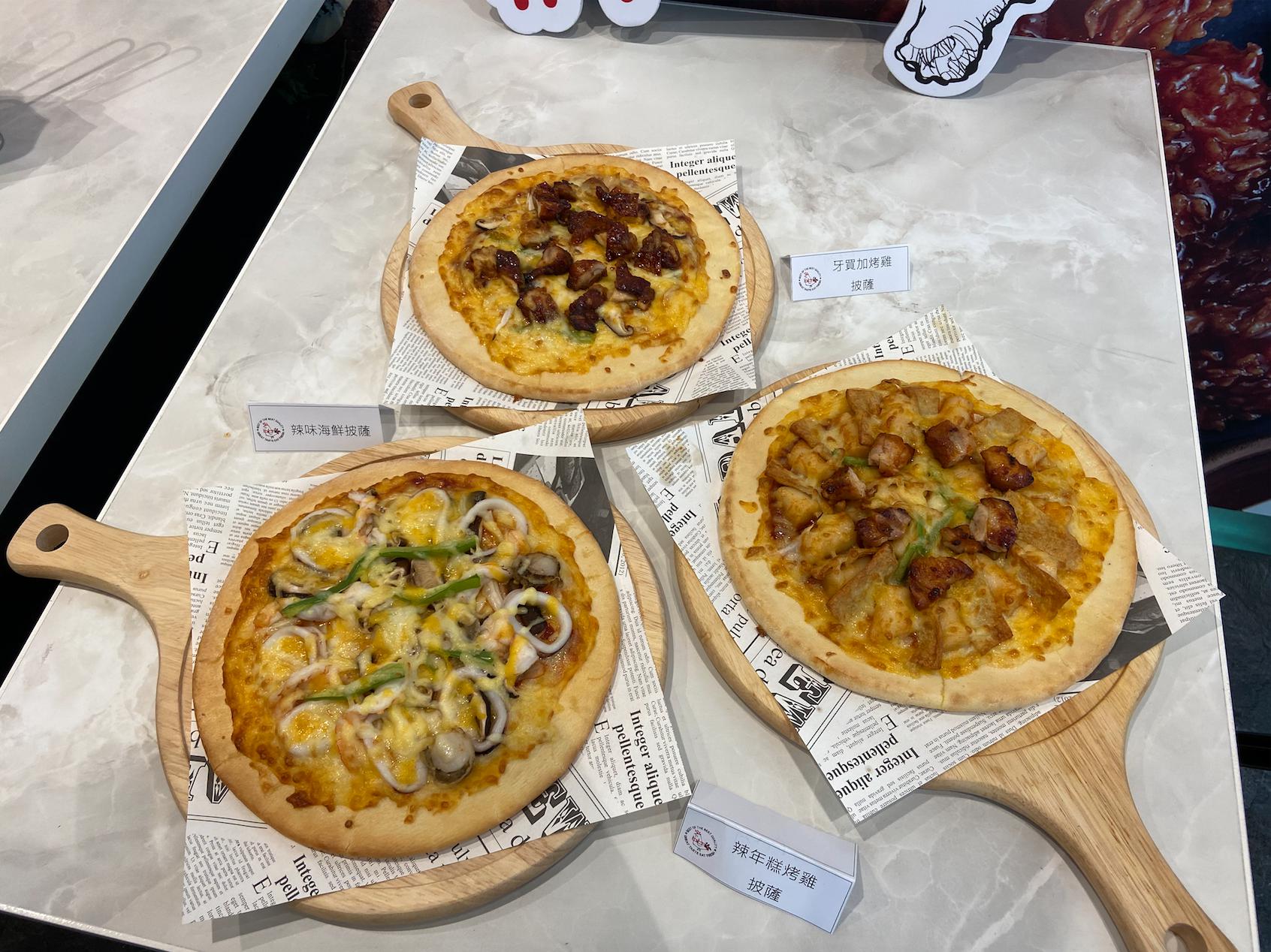 「辣味海鮮披薩」則是使用辣味炸雞醬料混入義大利披薩為基底,加入花枝、帆立貝、白蝦等海鮮,香辣口感,絕對讓人驚艷