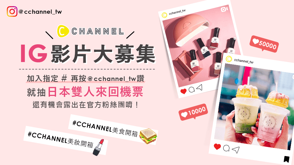 在自己 IG 帳號上傳 1 隻 15~20 秒美妝開箱或美食開箱影片,並加入指定 Hashtag:#CCHANNEL美妝開箱 #CCHANNEL美食開箱,再追蹤 C CHANNEL IG @cchannel_tw,即有機會抽到日本雙人來回機票。