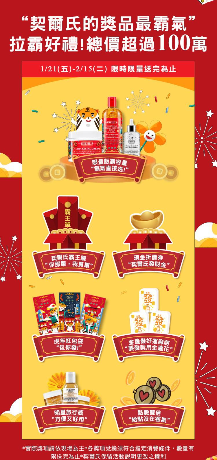 精彩絕倫的紅包內容史前無例,不但有機會抽中頭獎「價值$8,888 霸王單」,更有機會獲得「點數雙倍贈」、「$555 折價券」、「2022 虎年限量版霸容量明星」,絕對人人有獎的超值活動就是要讓每一位來KIEHL’S 契爾氏的消費者都能滿載而歸,讓這份好彩頭開啟大家 2022 美好幸運的一年!