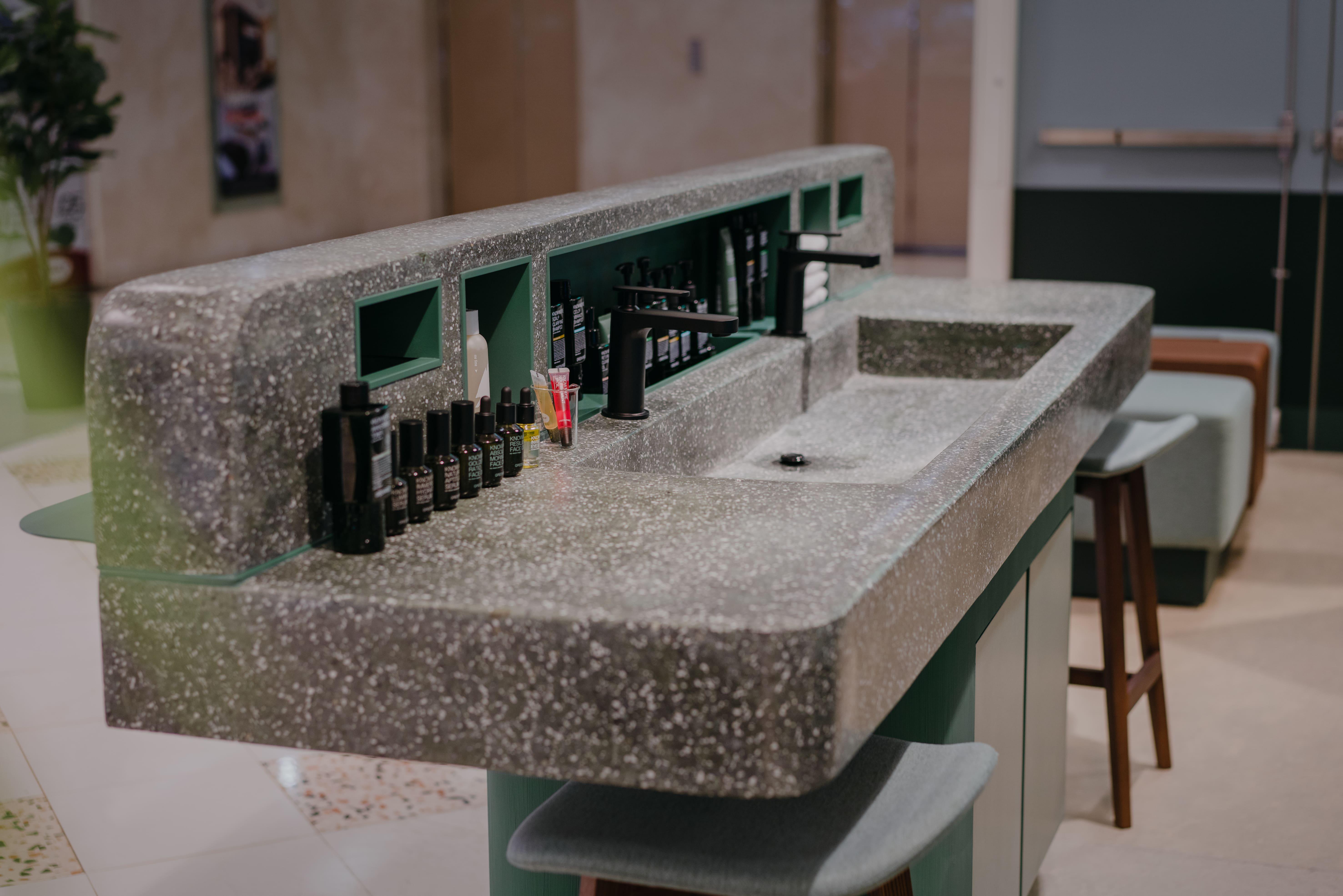 長型洗⼿槽、檯⾯,以台灣老屋的傳統磨⽯⼦打造,融入了在地蚵殼⼀起打磨,訴說著安平的產蚵⽂化,將廢棄蚵殼燒成灰,融入造船、蓋房磚瓦黏合使⽤的早期⽣活景象。店內的櫃體更採⽤了「樂⼟灰泥」,源⾃成⼤研發團隊發明的創新塗料,將台灣⼤量、且看似無⽤的⽔庫淤泥,透過再⽣利⽤的技術,賦予新的意義,呼應綠藤在產品研發上,優先選擇循環經濟原料的理念。